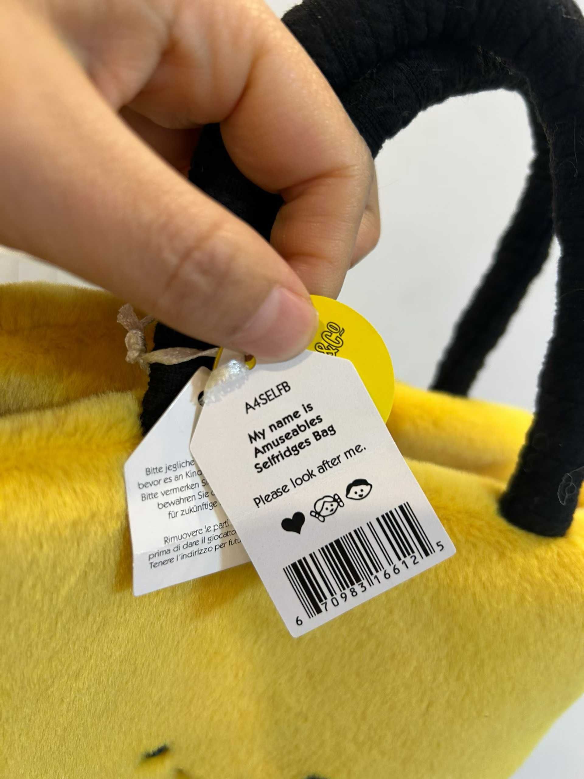 The Amuseables Selfridges Bag Jellycat was released on Monday 3November online andinstores as a UK exclusive. To celebrate25 years of the partnership between Selfridges andJellycat, they have collaborated to make the iconic yellow bag in Jellycat style. The bag is madefrom super soft Selfridges yellow coloured fur, with corduroy handles, smilling face with the'Selfridge & Co' logo on the front and the embroidered Jack stamp on the back!